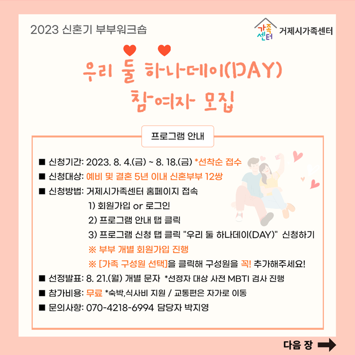 °ÅÁ¦½Ã°¡Á·¼¾ÅÍ È¨ÆäÀÌÁö(http://geoje.familynet.or.kr)¸¦ ÅëÇØ 8¿ù 4ÀϺÎÅÍ 8¿ù18ÀϱîÁö Á¢¼ö °¡´ÉÇÏ¸ç ±Ã±ÝÇÑ »çÇ×Àº °ÅÁ¦½Ã°¡Á·¼¾ÅÍ ¢Î070-4218-6994·Î ¹®ÀÇÇÏ¸é µÈ´Ù.