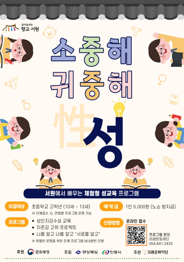 ÃʵîÇб³ °íÇгâ(10¼¼~13¼¼)À» ´ë»óÀ¸·Î ¿Â¶óÀÎ(Æ÷½ºÅÍ ¿Â¶óÀÎ QR ¸µÅ© Á¢¼Ó)À¸·Î Á¢¼ö ÁøÇàÇϸç Âü°¡ºñ´Â 1Àδç 5,000¿øÀÌ´Ù.