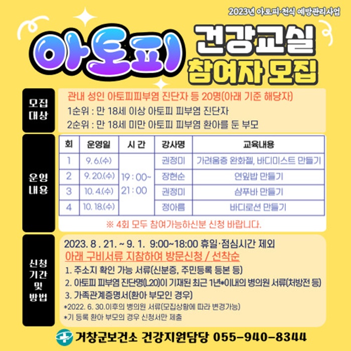 À̹ø ÇÁ·Î±×·¥Àº ¼ºÀÎ ¾ÆÅäÇÇ ÇǺο° ȯÀÚ µî 20¸íÀ» ´ë»óÀ¸·Î ¾Ë·¹¸£±âÁúȯ °ü¸® ´É·Â Çâ»ó, °Ç°ÁõÁøÀ» À§ÇÑ Áö½Ä±³À°°ú Èú¸µ üÇèÀ¸·Î ±¸¼ºµÅ 9~10¿ù µÎ ´Þ°£ ¿ù 2ȸ(ÃÑ 4ȸ), ¼ºÀεéÀÇ Âü¿©¸¦ À§ÇØ Àú³á ½Ã°£´ëÀÎ ¿ÀÈÄ 7~9½Ã¿¡ ¿î¿µµÉ ¿¹Á¤ÀÌ´Ù.