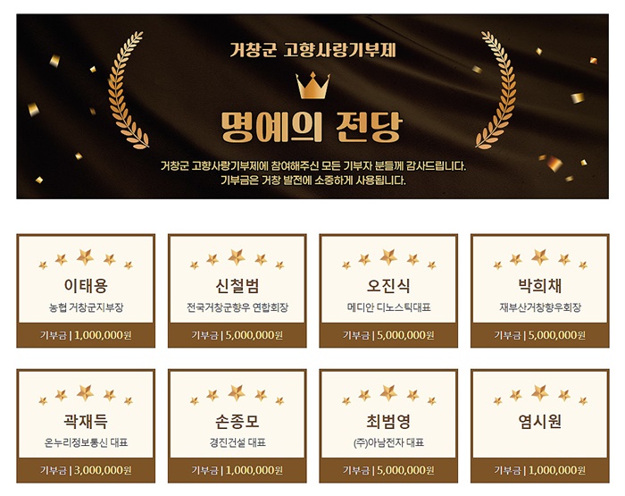 Áö³ 1¿ù ½Åö¹ü Àü±¹°ÅâÇâ¿ì¿¬ÇÕȸÀåÀÇ °íÇâ»ç¶û±âºÎÁ¦ 1È£ ±âºÎ¸¦ ½ÃÀÛÀ¸·Î ¹ÚÈñä ÀçºÎ»ê°ÅâÇâ¿ìȸÀå, À̺´¿À Àç°æ°ÅâÇâ¿ìȸÀå, ÀÌÁø±Ô Àü)Àç°æ°ÅâÇâ¿ìȸÀå µî 11¸íÀÌ °íÇâ»ç¶û±âºÎÁ¦ ÃÖ°í¾×ÀÎ 500¸¸ ¿øÀ» ±âºÎÇß´Ù.