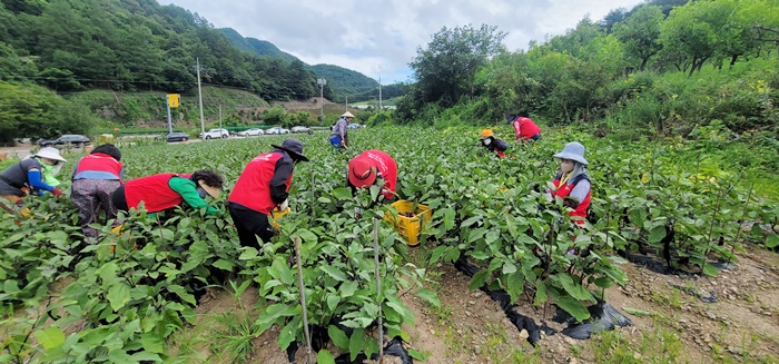 [½Ã»çÄÚ¸®¾ÆÀú³Î=±è¿¬ÇÐ ±âÀÚ] ¿µ¾ç±º¿©¼º´ÜüÇùÀÇȸ(ȸÀå ÃÖ°è¼÷) ȸ¿ø 10¿© ¸íÀº 18ÀÏ ³óÀÛ¹° ¼öÈ®±â¸¦ ¾ÕµÎ°í ÀϼպÎÁ·À¸·Î ¾î·Á¿òÀ» °Þ°í ÀÖ´Â ¼öºñ¸é Áׯď®ÀÇ ÇÑ ³ó°¡¸¦ ¹æ¹®ÇØ ÀϼÕÀ» µµ¿Ô´Ù.