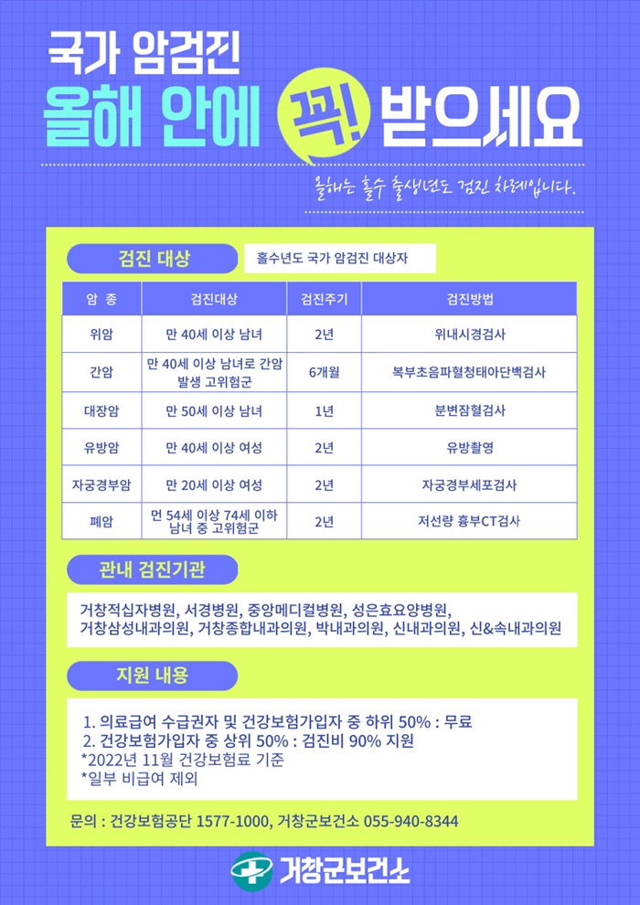 ¿ÃÇØ ±¹°¡ ¾Ï°ËÁø ´ë»óÀº Ȧ¼ö ¿¬µµ Ãâ»ýÀÚ·Î ¡âÀ§¾Ï ¸¸ 40¼¼ ÀÌ»ó ³²³à ¡âÀ¯¹æ¾Ï ¸¸ 40¼¼ ÀÌ»ó ¿©¼º ¡âÀڱðæºÎ¾Ï ¸¸ 20¼¼ ÀÌ»ó ¿©¼º ¡âÆó¾Ï ¸¸ 54~74¼¼ ³²³à Áß Æó¾Ï ¹ß»ý °íÀ§Ç豺 ¡â´ëÀå¾Ï ¸¸ 50¼¼ ÀÌ»ó ³²³à(1³â ÁÖ±â) ¡â°£¾Ï ¸¸ 40¼¼ ÀÌ»ó ³²³à Áß °£¾Ï ¹ß»ý °íÀ§Ç豺(6°³¿ù ÁÖ±â)Àº Ãâ»ý ¿¬µµ¿Í °ü°è ¾øÀÌ °ËÁøÀÌ °¡´ÉÇÏ´Ù.