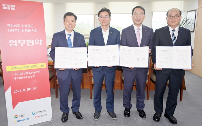 ÇÑÆí °æ³²µµÃ»¿¡¼ ¿¸° °æ»ó³²µµ ¼Ò»ó°øÀÎ ±ÝÀ¶ºÎ´ã ¿Ïȸ¦ À§ÇÑ ¾÷¹« Çù¾à½Ä¿¡´Â BNK°æ³²ÀºÇà ½Åżö ºÎÇàÀå, °æ»ó³²µµ ±èº´±Ô °æÁ¦ºÎÁö»ç, °æ³²½Å¿ëº¸ÁõÀç´Ü ÀÌÈ¿±Ù ÀÌ»çÀå, NH³óÇùÀºÇà °æ³²º»ºÎ Á¶±Ù¼ö º»ºÎÀå µîÀÌ Âü¼®Çß´Ù.
