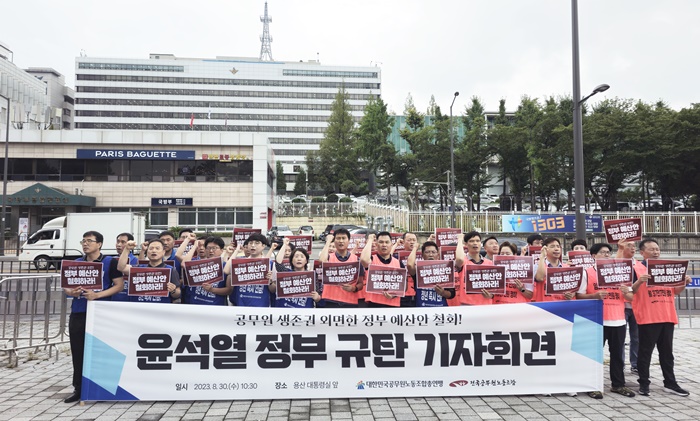 | ´ëÇѹα¹°ø¹«¿ø³ëµ¿Á¶ÇÕÃÑ¿¬¸ÍÀº 30ÀÏ ¼¿ï ¿ë»ê±¸ ´ëÅë·É½Ç ÀÏ´ë¿¡¼ Àü±¹°ø¹«¿ø³ëµ¿Á¶ÇÕ¿Í °øµ¿À¸·Î '°ø¹«¿ø »ýÁ¸±Ç ¿Ü¸éÇÑ Á¤ºÎ ¿¹»ê¾È öȸ! À±¼®¿ Á¤ºÎ ±Ôź ±âÀÚȸ°ß'À» ÁøÇàÇß´Ù. |