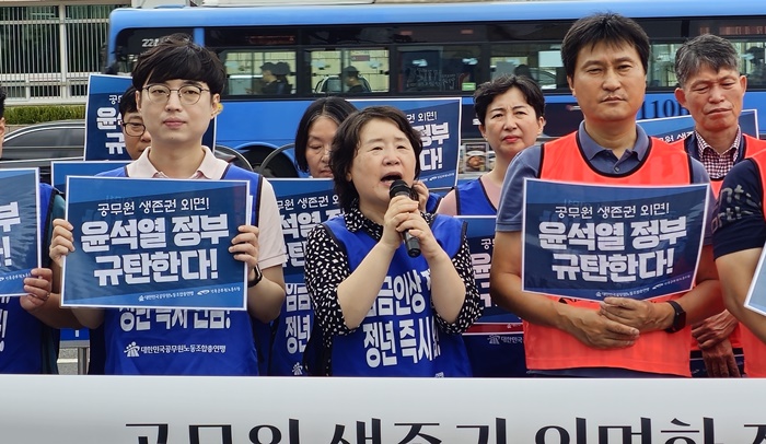 ±âÀÚȸ°ß Âü¼®ÀÚµéÀº '°ø¹«¿ø »ýÁ¸±Ç ¿Ü¸é! Á¤ºÎ ¿¹»ê¾È öȸÇ϶ó!', '°ø¹«¿ø »ýÁ¸±Ç ¿Ü¸é! À±¼®¿ Á¤ºÎ ±ÔźÇÑ´Ù!' µîÀÇ ±¸È£°¡ ÀûÈù ¼ÕÆÖ¸»À» µé°í, Á¤ºÎ¿¡ ¹«Ã¥ÀÓÇÑ °áÁ¤À» ±ÔźÇϰí, Á¶¼ÓÈ÷ ³»³âµµ Á¤ºÎ ¿¹»ê¾È öȸ¿Í ÇÏÀ§Á÷ û³â °ø¹«¿øÀÇ Ã³¿ì°³¼± ´ëÃ¥À» ¸¶·ÃÇÒ °ÍÀ» Ã˱¸Çß´Ù.