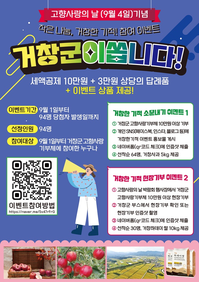 ¶ÇÇÑ, 9¿ù 2ÀϺÎÅÍ 4ÀϱîÁö ¿¸®´Â ‘Á¦1ȸ °íÇâ»ç¶ûÀÇ ³¯ ¹Ú¶÷ȸ’¸¦ Á÷Á¢ ¹æ¹®ÇØ ÇöÀå¿¡¼ °Åⱺ¿¡ ±âºÎÇÑ ÈÄ ´ã´çÀÚ È®ÀÎÀ» ¹Þ°Å³ª ÀÎÁõ»çÁøÀ» Á¦ÃâÇÏ¸é ¼±Âø¼ø 30¸í¿¡°Ô ûÁ¤ÇÑ °Åâ¿¡¼ ÀÚ¶õ Çϵ¥ÀÌ½Ò 10kg 3¸¸ ¿ø »ó´çÀ» Á¦°øÇÑ´Ù.