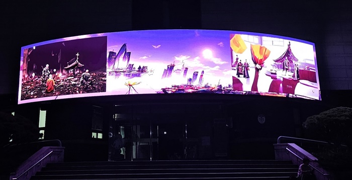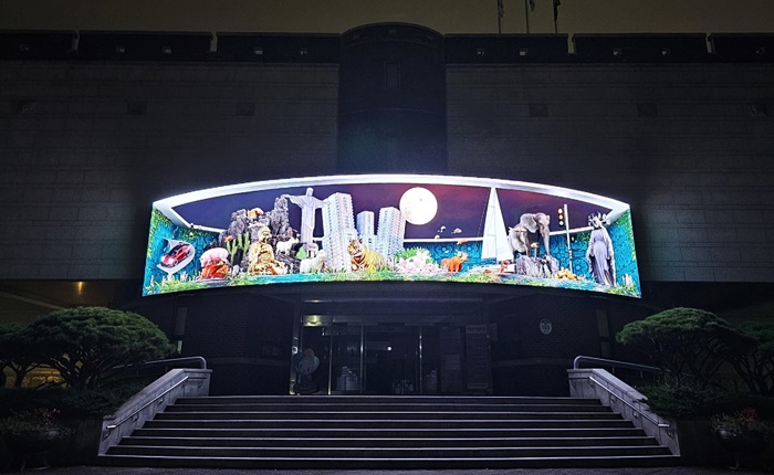 ¸¶»ê¹Ú¹°°ü ¿Üº®¿¡ ¼³Ä¡µÇ¾î ÀÖ´Â ´ëÇü LED¹Ìµð¾î¾ÆÆ®¿ùÀ» ÅëÇØ »õ·Ó°Ô ¼±º¸ÀÌ´Â ±¹¸³¾Æ½Ã¾Æ¹®ÈÀü´çÀç´Ü(ACCF) ÀÛǰÀº 2ÆíÀ¸·Î, Á¶¿µ°¢ ÀÛ°¡ÀÇ <¾ÆÈ©, ±¸¸§, ²Þ>Àº Á¶¼±½Ã´ë ±¹¹® ¼Ò¼³ÀÎ ±è¸¸ÁßÀÌ ÁöÀº <±¸¿î¸ù>À» Çö´ëÀû ½Ã°¢À¸·Î °¢»öÇØ ÀΰøÁö´É(AI) ±â¼úÀ» Ȱ¿ëÇØ ±¸¼ºÇÑ ÀÛǰÀÌ´Ù.