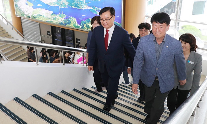 | â¿øÆ¯·Ê½Ã´Â 1ÀÏ Ã¢¿ø½Ãû¿¡¼ 'ä½ÄÇϰí, °è´ÜŸ°í, ÆÈÆÈÇϰÔ!' ½½·Î°ÇÀ» ¼±¾ðÇß´Ù. »çÁøÀº ¼±¾ð½Ä ÈÄ È«³²Ç¥ ½ÃÀå°ú Á÷¿øµéÀÌ °É¾î¼ °è´ÜÀ» ¿À¸£°í ÀÖ´Â ¸ð½À. |