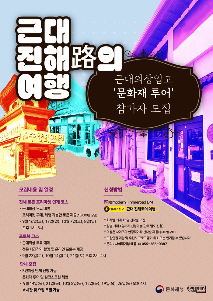 9¿ù 14ÀϺÎÅÍ 10¿ù 26ÀϱîÁö ÁøÇàµÇ´Â ¹®ÈÀç Åõ¾î´Â ¼±Âø¼ø ¹«·áÀ̸ç, »ó½Ã ¸ðÁýÀ» ½Ç½ÃÇÏ¿© Èñ¸ÁÇÏ´Â ³¯Â¥ 5ÀÏ Àü±îÁö ÀνºÅ¸±×·¥ @modern_jinhaeroad ¶Ç´Â īī¿ÀÅå Ç÷¯½ºÄ£±¸ ‘±Ù´ë ÁøÇØ·ÎÀÇ ¿©Çà’À» ÅëÇØ ½ÅûÇÒ ¼ö ÀÖ´Ù.