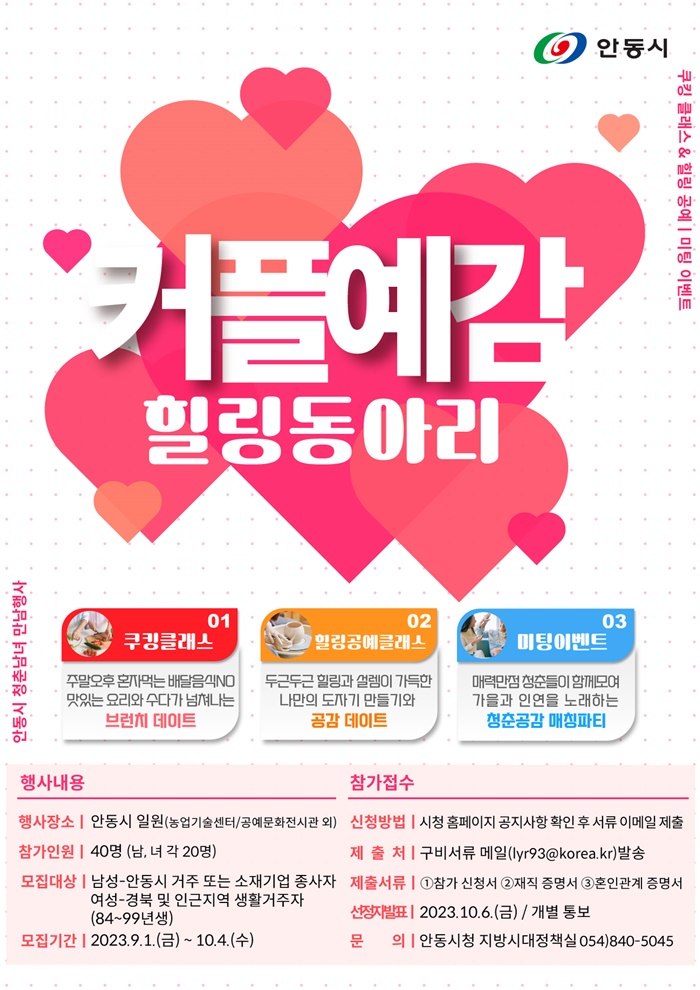 Âü°¡´ë»óÀº ¾Èµ¿¿¡ °ÅÁÖÇϰųª ¼ÒÀç ±â¾÷¿¡ Á¾»çÇÏ´Â 1984³â»ýºÎÅÍ 1999³â»ý±îÁöÀÇ Á÷ÀåÀÎ ¹ÌÈ¥³²³àÀ̸ç, ³²ÀÚ 20¸í, ¿©ÀÚ 20¸í ÃÑ 40¸íÀ» ¸ðÁýÇÑ´Ù.