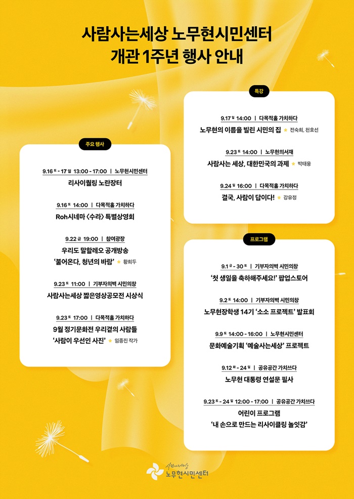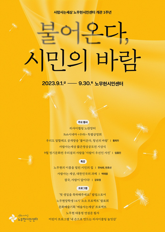 [½Ã»çÄÚ¸®¾ÆÀú³Î=Á¤Á¾¹Î ¼±ÀÓ±âÀÚ] »ç¶÷»ç´Â¼¼»ó ³ë¹«Çö½Ã¹Î¼¾ÅͰ¡ ¿À´Â 9¿ù 23ÀÏ °³°ü 1ÁÖ³âÀ» ¸Â´Â´Ù.