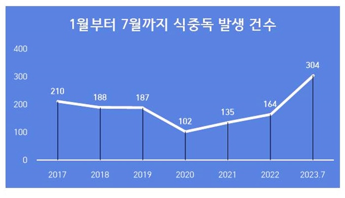 ÀÎÀç±Ù ÀÇ¿ø(´õºÒ¾î¹ÎÁÖ´ç/º¸°Çº¹ÁöÀ§¿øÈ¸)°¡ ½Ä¾àó·ÎºÎÅÍ ¹ÞÀº ÃÖ±Ù 7³â°£(2017³â~2023³â 7¿ù) ¿¬µµº°·¿ùº° ½ÄÁßµ¶ ¹ß»ý ÇöȲ ÀÚ·á¿¡ µû¸£¸é 1¿ùºÎÅÍ 7¿ù±îÁö ½ÄÁßµ¶ ¹ß»ý °Ç¼ö´Â 2017³â Àüü 336°Ç Áß 210°Ç(65%), 2018³â 363°ÇÁß 188°Ç(52%), 2019³â 286°ÇÁß 187°Ç(65%), 2020³â 164°Ç Áß102°Ç(62%), 2021³â 245°Ç Áß 135°Ç(55%), 2022³â 304°Ç Áß 164°Ç(54%)À̾ú´øµ¥ ºñÇØ 2023³â 304°ÇÀ¸·Î Àü³â´ëºñ ¾à 185% Áõ°¡Çß´Ù.