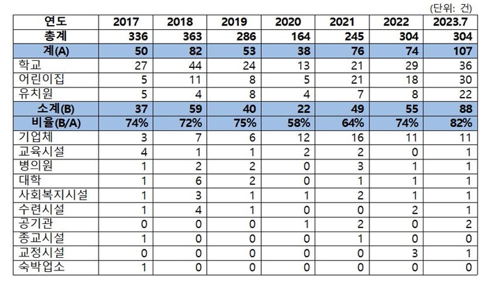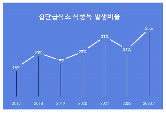 ¹ß»ýÀå¼Ò´Â, Çб³¸¦ Æ÷ÇÔÇÑ Áý´Ü±Þ½Ä¼Ò¿¡¼ ½ÄÁßµ¶ ¹ß»ý ºñÀ²Àº Àüü ¹ß»ý °Ç Áß 2017³â 15%(50°Ç), 2018³â 23%(82°Ç), 2019³â 19%(53°Ç), 2020³â 23%(38°Ç), 2021³â 31%(76°Ç), 2022³â 24%(74°Ç), 2023³â 7¿ù¸» ÇöÀç 35%(107°Ç)¸¦ Â÷ÁöÇϸç Á¡Â÷ Áõ°¡ÇÏ´Â Ãß¼¼¸¦ ³ªÅ¸³»´Â °ÍÀ¸·Î È®ÀεƴÙ.