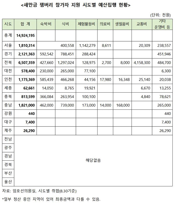 ´õºÒ¾î¹ÎÁÖ´ç ÇàÁ¤¾ÈÀüÀ§¿øÈ¸ ÀÓÈ£¼±(ÁõÆò·ÁøÃµ·À½¼º) ÀÇ¿øÀÌ 17°³ ½Ãµµ·ÎºÎÅÍ Á¦Ãâ¹ÞÀº »õ¸¸±Ý Àë¹ö¸® ÁöÀÚü ¿¹»ê ÁýÇà ÇöȲ¿¡ µû¸£¸é, ¼¿ï·°æ±â·ÀüºÏ µî 11°³ ½Ãµµ¿¡¼ Àë¹ö¸® Âü°¡ÀÚµéÀ» À§ÇØ ¼÷¹Úºñ, ½Äºñ, üÇèȰµ¿ºñ, ±³Åëºñ µîÀ¸·Î ÁýÇàÇÑ ¿¹»êÀº ÃÑ 150¾ï¿ø¿¡ À̸¥ °ÍÀ¸·Î ³ªÅ¸³µ´Ù.