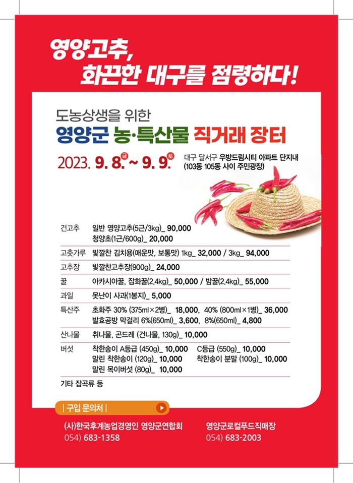 ¿µ¾ç±ºÀÇ ¿ì¼ö ³óƯ»ê¹° ÆÇ·Î°³Ã´°ú ½Å¼±ÇÏ°í ¾ÈÀüÇÑ ³óƯ»ê¹°À» ÇÕ¸®ÀûÀÎ °¡°Ý¿¡ »ì ¼ö ÀÖ´Â À̹ø Á÷°Å·¡ Çà»ç´Â ¿µ¾ç±º ³óƯ»ê¹° È«º¸ ¹× ÆÇ¸Å¿Í ÇÔ²² 18ÀÏ °³ÃֵǴ ¿µ¾ç °íÃß H.O.T Festival Çà»ç »çÀüÈ«º¸µµ º´ÇàÇØ ´õ¿í Å« Àǹ̰¡ ÀÖ´Ù.