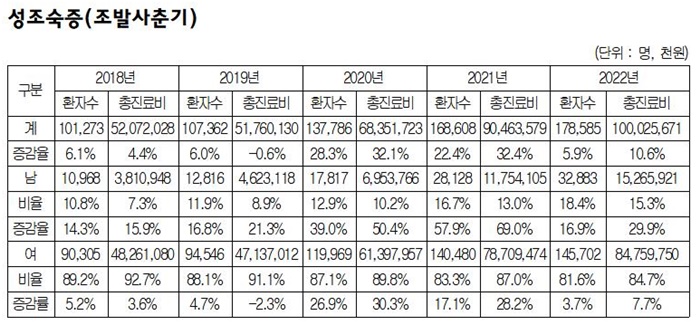 ½Ä½À°ü(ºñ¸¸), »ýȰȯ°æ, ȯ°æÈ£¸£¸ó µîÀÇ ¿µÇâÀÌ Å« ¼ºÁ¶¼÷Áõ ȯÀÚ¼ö´Â Áö³ÇØ 17¸¸8õ¿©¸í(17¸¸8,585¸í)¿¡ ´ÞÇϰí, ÀÌ¿¡ µû¸¥ Áø·áºñ°¡ ¹«·Á 1,000¾ï¿øÀÌ ³Ñ´Â °ÍÀ¸·Î Á¶»çµÆ´Ù.