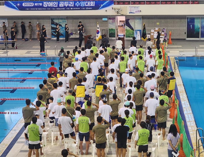 [½Ã»çÄÚ¸®¾ÆÀú³Î=Á¤Á¾¹Î ¼±ÀÓ±âÀÚ] â¿øÆ¯·Ê½Ã(½ÃÀå È«³²Ç¥)´Â 10ÀÏ Á¦17ȸ Àå¾ÖÀΰõµÎ¸®¼ö¿µ´ëȸ¸¦ â¿øÁ¾ÇտÀå ½Ç³»¼ö¿µÀå¿¡¼ ÇØ±º Ư¼öÀüÀü´Ü(UDT/SEAL) À庴, ÀÚ¿øºÀ»çÀÚ, Àå¾ÖÀÎ ¼±¼ö ¹× °¡Á· µî 300¿©¸íÀÌ Âü¿©ÇÑ °¡¿îµ¥ ¼ºÈ²¸®¿¡ °³ÃÖÇß´Ù.