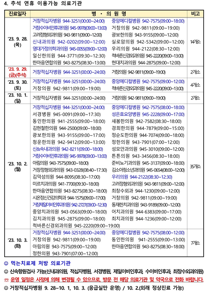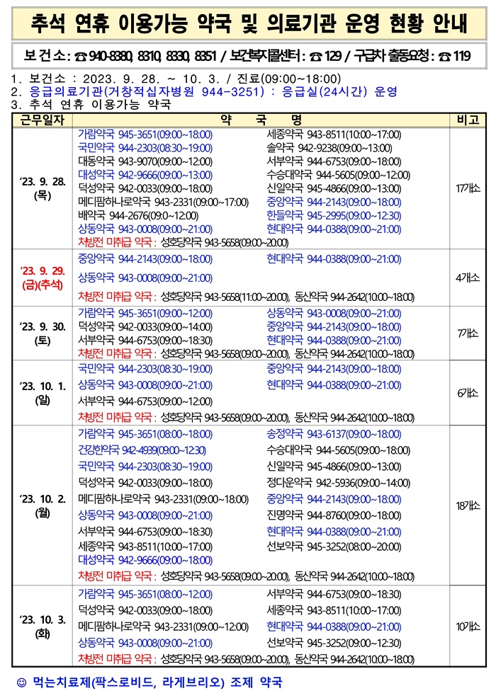 Ãß¼® ¿¬ÈÞ ±â°£ÀÎ 9¿ù 28ÀϺÎÅÍ 10¿ù 3ÀϱîÁö ÀÇ·á°ø¹é ÃÖ¼ÒÈ¿Í ÀÀ±ÞȯÀÚ ¹ß»ý ½Ã ½Å¼ÓÇÑ ´ëó¸¦ À§ÇØ º¸°Ç¼Ò ÀÀ±ÞÁø·á´ëÃ¥»óȲ½ÇÀ» Æ÷ÇÔÇÑ Áö¿ªÀÀ±ÞÀÇ·á±â°ü 1°³¼Ò¿Í º´·ÀÇ¿ø 40°³¼Ò, ¾à±¹ 22°³¼Ò°¡ ¿î¿µµÈ´Ù.