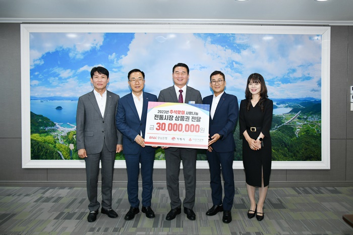 [½Ã»çÄÚ¸®¾ÆÀú³Î=Á¤Á¾¹Î ¼±ÀÓ±âÀÚ] BNK°æ³²ÀºÇà °ÅÁ¦ÁöÁ¡(ÁöÁ¡Àå ±èÅÂÁß)Àº Áö³ 20ÀÏ °ÅÁ¦½ÃûÀ» ¹æ¹®ÇØ Ãß¼®¸íÀýÀ» ¸Â¾Æ ¼Ò¿ÜµÈ Àú¼Òµæ ÀÌ¿ôÀ» À§ÇÑ ÀüÅë½ÃÀå »óǰ±Ç 3,000¸¸¿øÀ» ±âŹÇß´Ù.