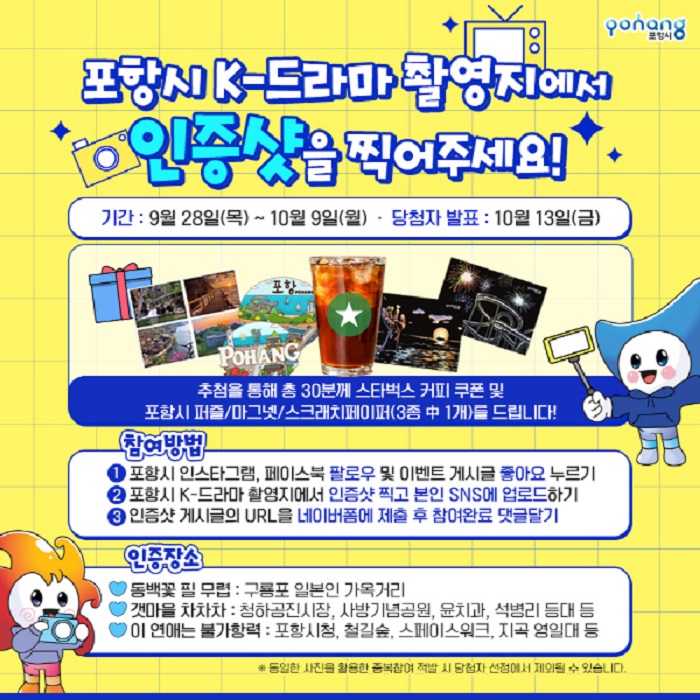[½Ã»çÄÚ¸®¾ÆÀú³Î=°æºÏÃëÀ纻ºÎ] Æ÷Ç׽ô Ãß¼® ¿¬ÈÞ¸¦ ¸Â¾Æ 9¿ù 28ÀϺÎÅÍ 10¿ù 9ÀϱîÁö ‘K-µå¶ó¸¶ ÃÔ¿µÁö ¹æ¹®ÇÏ°í Æ÷Ç× ±â³äǰÀ̶û Ä¿ÇÇ ÄíÆù ¹ÞÀÚ!’ À̺¥Æ®¸¦ ÁøÇàÇÑ´Ù.