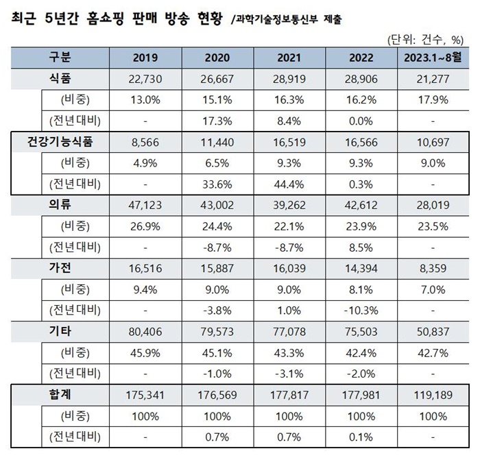 ±¹È¸ ±¹¹ÎÀÇÈû °±âÀ± ÀÇ¿ø(â¿ø½Ã ¼º»ê±¸, º¸°Çº¹ÁöÀ§¿øÈ¸ °£»ç)ÀÌ Áö³ 1ÀÏ °úÇбâ¼úÁ¤º¸Åë½ÅºÎ·ÎºÎÅÍ Á¦Ãâ¹ÞÀº ‘ÃÖ±Ù 5³â°£ Ȩ¼îÇÎ ÆÇ¸Å ¹æ¼ÛÇöȲ’ ÀÚ·á¿¡ µû¸£¸é ÀÇ·ù, °¡Àü¿¡ ´ëÇÑ È¨¼îÇÎ ÆÇ¸Å ¹æ¼Û Ƚ¼ö´Â ÁÙ¾îµç ¹Ý¸é °Ç°±â´É½Äǰ ¹æ¼Û Ƚ¼ö´Â ±ÞÁõÇÑ °ÍÀ¸·Î Á¶»çµÆ´Ù.