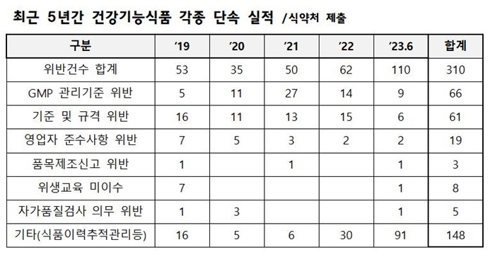 ½ÄǰÀǾàǰ¾ÈÀüóºÎÅÍ Á¦Ãâ¹ÞÀº ‘ÃÖ±Ù 5³â°£ °Ç°±â´É½Äǰ °¢Á¾ ´Ü¼Ó ½ÇÀû’ ÀÚ·á¿¡ µû¸£¸é 2019³âºÎÅÍ ¿ÃÇØ 6¿ù±îÁö ±âÁØ ¹× ±Ô°Ý À§¹Ý, ǰ¸ñÁ¦Á¶½Å°í À§¹Ý, ÀÚ°¡Ç°Áú°Ë»ç Àǹ« À§¹Ý µîÀ¸·Î Á¦Á¶°¡ Á¤ÁöµÇ°Å³ª Á¦Ç°ÀÌ Æó±âµÈ °Ç°±â´É½ÄǰÀº ¸ðµÎ 310°Ç¿¡ ´ÞÇÏ´Â °ÍÀ¸·Î µå·¯³µ´Ù.