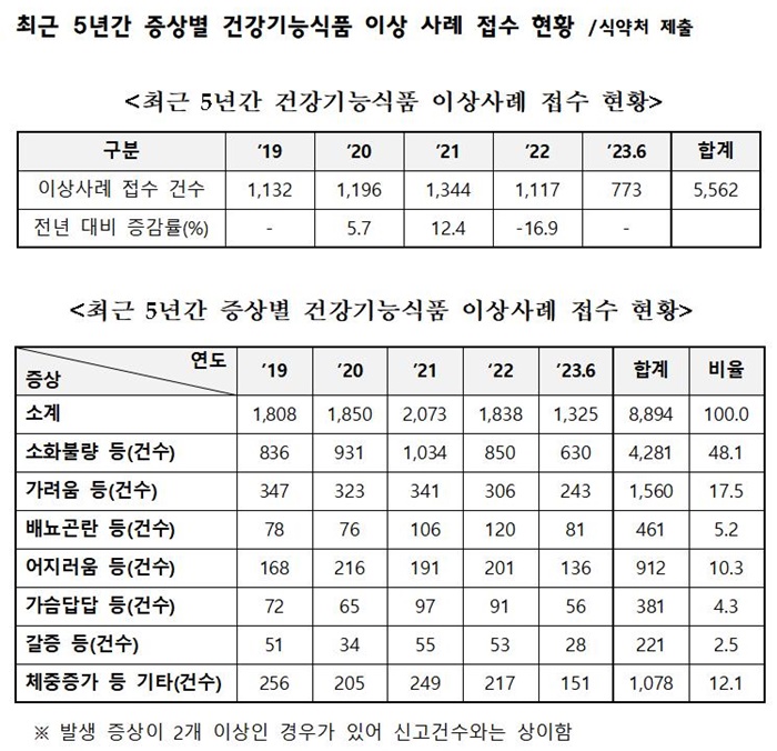‘ÃÖ±Ù 5³â°£ °Ç°±â´É½Äǰ Áõ»óº° °Ç°±â´É½Äǰ ÀÌ»ó»ç·Ê Á¢¼ö ÇöȲ’ ÀÚ·á¿¡ µû¸£¸é 2019³âºÎÅÍ ¿ÃÇØ 6¿ù±îÁö °Ç°±â´É½Äǰ¿¡ ´ëÇÑ ÀÌ»ó»ç·Ê ½Å°í °Ç¼ö´Â ¸ðµÎ 5,562°ÇÀ̾úÀ¸¸ç, ÀÌ»ó Çö»óÀÌ ¹ß»ýÇÑ »ç·Ê´Â ¸ðµÎ 8,894°ÇÀ¸·Î Á¶»çµÆ´Ù.