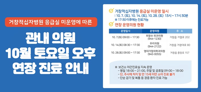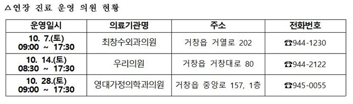 [½Ã»çÄÚ¸®¾ÆÀú³Î=Á¤Á¾¹Î ¼±ÀÓ±âÀÚ] °ÅⱺÀº °ÅâÀû½ÊÀÚº´¿øÀÌ ÀÇ·áÀη ºÎÁ· µîÀ¸·Î ¿À´Â 10¿ù 7 · 14 · 28ÀÏ Åä¿äÀÏ ¿ÀÈÄ 1½ÃºÎÅÍ 5½Ã 30ºÐ±îÁö ÀÀ±Þ½Ç ¿î¿µÀ» Áß´ÜÇÔ¿¡ µû¶ó, ÀÌ ±â°£¿¡ °ü³» 3°³ ÀÇ¿øÀÌ ¿ÀÈÄ ¿¬Àå Áø·á¸¦ ½ÃÇàÇÑ´Ù°í 4ÀÏ ¹àÇû´Ù.