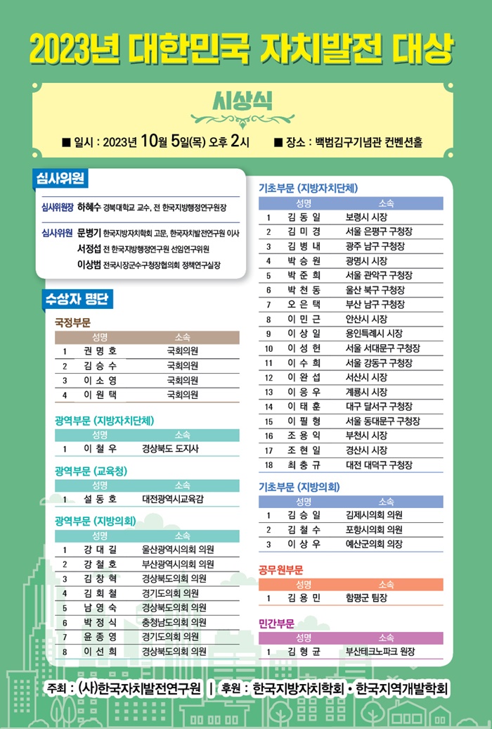 ¹é¹ü±è±¸±â³ä°ü ÄÁº¥¼ÇȦ¿¡¼ °³ÃÖµÈ ´ëÇѹα¹ ÀÚÄ¡¹ßÀü ´ë»ó ½Ã»ó½ÄÀº 2017³â¿¡ ½ÃÀÛµÇ¾î ¿ÃÇØ 7ȸ°·Î Áö¹æÀÚÄ¡ ¹× ±³À°ÀÚÄ¡ÀÇ ¹ßÀü¿¡ À̹ÙÁöÇÑ ±¹È¸ÀÇ¿ø, Áö¹æÀÚÄ¡´ÜüÀå, ±³À°°¨, Áö¹æÀÇȸÀÇ¿ø, °ø¹«¿ø µî 4°³ ºÎ¹®(±¹Á¤, ±¤¿ª, ±âÃÊ, ±âŸ) 37¸íÀÇ À¯°øÀÚ¿¡°Ô ½Ã»óÇß´Ù.
