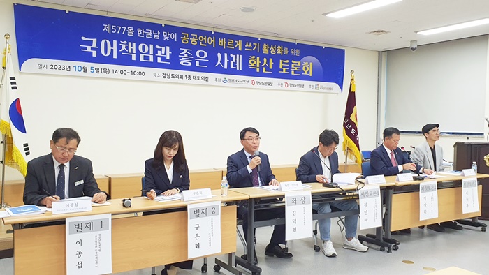 [½Ã»çÄÚ¸®¾ÆÀú³Î=Á¤Á¾¹Î ¼±ÀÓ±âÀÚ] °æ³²µµ±³À°Ã»(±³À°°¨ ¹ÚÁ¾ÈÆ)ÀÌ 5ÀÏ ¿ÀÈÄ 2½Ã °æ³²µµÀÇȸ 1Ãþ ´ëȸÀǽǿ¡¼ ¿¸° ‘Á¦577µ¹ Çѱ۳¯ ¸ÂÀÌ ±¹¾îÃ¥ÀÓ°ü ÁÁÀº »ç·Ê È®»ê Åä·Ðȸ’¿¡ Âü°¡ÇØ ±¹¾î ¹Ù¸£°Ô ¾²±â »ç¾÷ ÃßÁø ¼º°ú¿Í ¿ì¼ö »ç·Ê¸¦ ¾Ë·È´Ù.