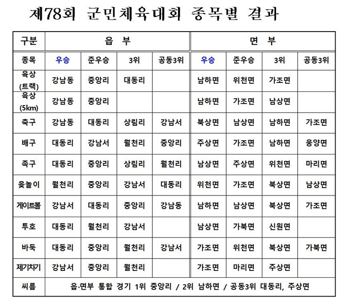 ÇÑÆí, Á¾¸ñº° À¾ºÎ ¿ì½ÂÆÀÀº °³²µ¿(À°»ó, 5km ´Þ¸®±â, Ã౸), ´ëµ¿¸®(¹è±¸, Á·±¸, ÅõÈ£, ¹ÙµÏ), ¿ùõ¸®(À·³îÀÌ), °³²¼(°ÔÀÌÆ®º¼, Á¦±âÂ÷±â), Áß¾Ó¸®(¾¾¸§)À̸ç, ¸éºÎ ¿ì½ÂÆÀÀº ³²Çϸé(À°»ó, 5km ´Þ¸®±â, °ÔÀÌÆ®º¼), ºÏ»ó¸é(Ã౸), ÁÖ»ó¸é(¹è±¸), ³²»ó¸é(Á·±¸, ÅõÈ£), À§Ãµ¸é(À·³îÀÌ), °¡Á¶¸é(¹ÙµÏ, Á¦±âÂ÷±â)ÀÌ´Ù.