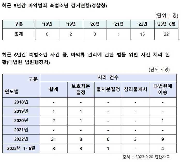 Ã˹ý¼Ò³âÀº °æÂû¿¡¼ °Ë°ÅµÈ ÀÌÈÄ, ¹Ù·Î ¹ý¿øÀ¸·Î ¼ÛÄ¡µÊ¿¡ µû¶ó ¸¶¾à¹üÁË Ã˹ý¼Ò³â ÇöȲÀÇ Á¤È®¼ºÀ» À§ÇØ ´ë¹ý¿ø ¹ý¿øÇàÁ¤Ã³¸¦ ÅëÇØ È®ÀÎÇÑ ‘Ã˹ý¼Ò³â »ç°Ç Áß, ¸¶¾à·ù°ü¸®¹ý À§¹Ý »ç°Ç ó¸® ÇöȲ’À» È®ÀÎÇÑ °á°ú 2019³â 1¸í, 2020³â 2¸íÀ̾ú´ø ¸¶¾à·ù°ü¸®¹ý À§¹Ý Ã˹ý¼Ò³â »ç°ÇÀÌ 2022³â 21°Ç, 2023³â 6¿ù±îÁö´Â 8°ÇÀ¸·Î ´ëÆø »ó½ÂÇß´Ù.