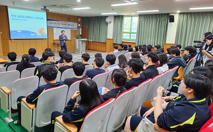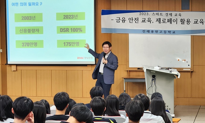 | BNK°æ³²ÀºÇà ÀÌ¿µµ¿ ÆÀÀåÀÌ ÁøÇØ¿ë¿ø°íµîÇб³ ÇлýµéÀ» ´ë»óÀ¸·Î ±ÝÀ¶±³À°À» Çϰí ÀÖ´Ù. |