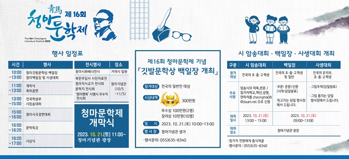 ¿ÃÇØ 16ȸ¸¦ ¸ÂÀÌÇÑ À̹ø û¸¶¹®ÇÐÁ¦´Â Àü½ÃÇà»ç¿Í º»Çà»ç·Î ±¸¼ºµÇ¾î ÀÖÀ¸¸ç, Àü½ÃÇà»ç´Â 10¿ù 5ÀÏ(¸ñ)ºÎÅÍ 11¿ù 5ÀÏ(ÀÏ)±îÁö û¸¶±â³ä°ü°ú °ÅÁ¦½Ã ÀÏ¿ø¿¡¼ û¸¶½Ãȹè³Ê, û¸¶Àۻ米°¡, ¹®ÇÐÁö µîÀ» Àü½ÃÇÑ´Ù.