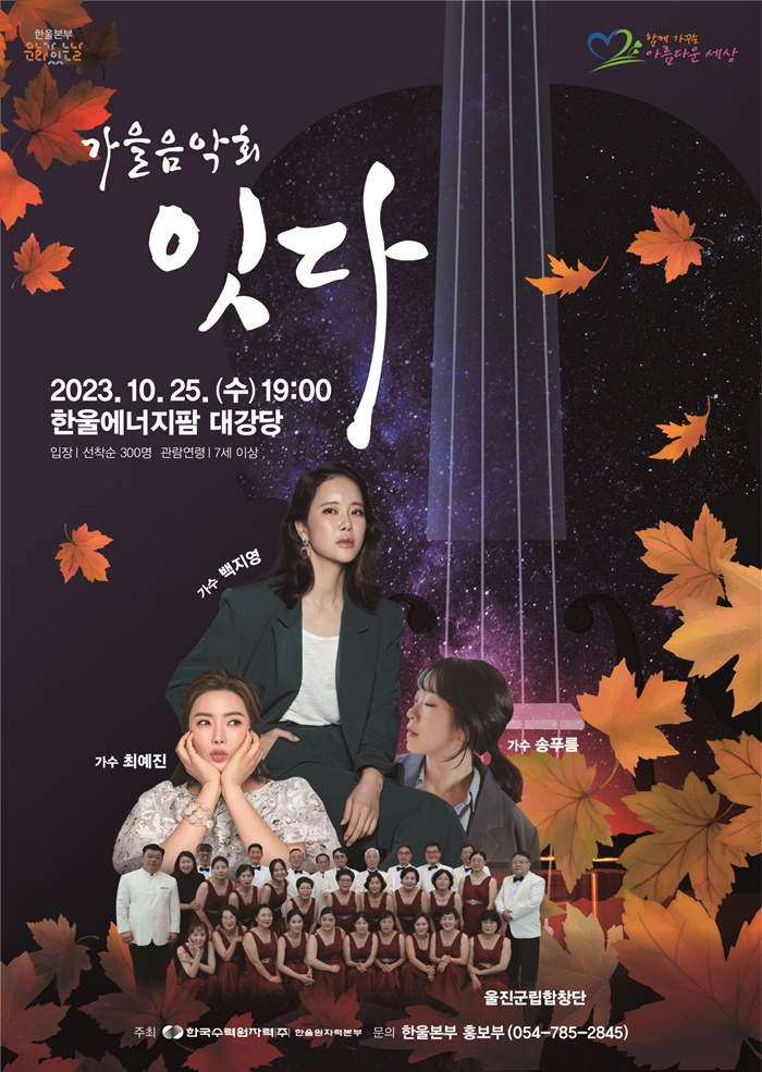 ¿Ã ÇÑ ÇØ ¹®È¿¹¼ú°ú À½¾ÇÀ¸·Î Áö¿ªÁֹΰú ÇѿﺻºÎ¸¦ À̾îÁØ 2023³â‘¹®È°¡ ÀÖ´Â ³¯’ÀÇ ´ë¹Ì¸¦ Àå½ÄÇÒ À̹ø °¡À»À½¾Çȸ ¡¸ÀÕ´Ù¡¹´Â Áö¿ªÁÖ¹ÎÀ¸·Î ±¸¼ºµÈ ¿ïÁø±º¸³ÇÕâ´ÜÀÇ °ø¿¬À» ½ÃÀÛÀ¸·Î Æ®·ÎÆ® °¡¼ö ÃÖ¿¹Áø, ¿ïÁø Ãâ½Å °¡¼ö ¼ÛǪ¸§, ¿©¼º ¹ß¶óµå °¡¼ö ¹éÁö¿µ ¼øÀ¸·Î ¾à 100ºÐ°£ ÁøÇàµÉ ¿¹Á¤ÀÌ´Ù.