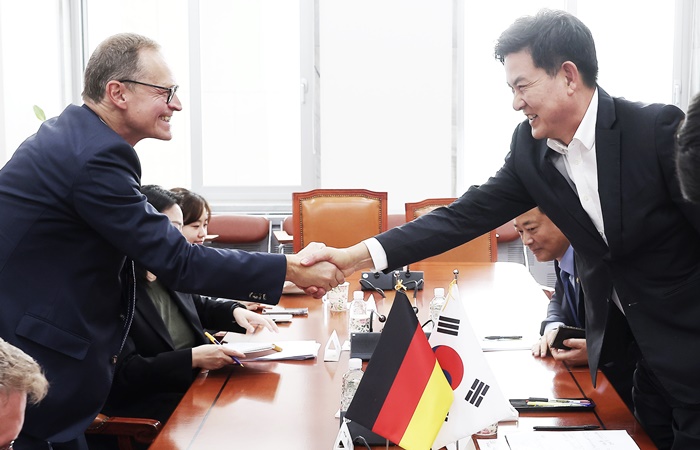 | ±¹È¸ ¿Ü±³ÅëÀÏÀ§¿øÈ¸ ±èÅÂÈ£ À§¿øÀåÀº 26ÀÏ ±¹È¸¿¡¼ µ¶ÀÏ ¿¬¹æÇÏ¿ø ´ëÇ¥´ÜÀ» ¸¸³ª Çѱ¹°ú µ¶ÀÏÀÇ ±³·ù Çù·Â È®´ë ¹× ±¹Á¦°øÁ¶ °È µî¿¡ ´ëÇÑ ÀǰßÀ» ±³È¯Çß´Ù. |