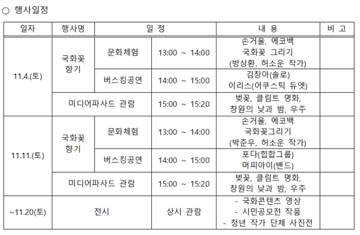 ¹®ÈüÇèÇà»ç´Â 11¿ù 4ÀÏ(Åä), 11ÀÏ(Åä) ¿ÀÈÄ 1½ÃºÎÅÍ 2½Ã±îÁö ¿¹Á¤À¸·Î ´©±¸³ª ÆíÇÏ°Ô Âü¿©°¡ °¡´ÉÇϸç û³â ¿¹¼úÀÛ°¡¿Í ÇÔ²² ¼Õ°Å¿ï, ¿¡Äڹ鿡 ±¹È²É°ú ³ª¸¸ÀÇ ±×¸²À» Á÷Á¢ ±×·Á ³ÖÀ» ¼ö ÀÖ¾î Âü¿©ÇÏ´Â ½Ã°£ÀÌ ´õ Áñ°Å¿ï °ÍÀ¸·Î ¿¹»óµÈ´Ù.