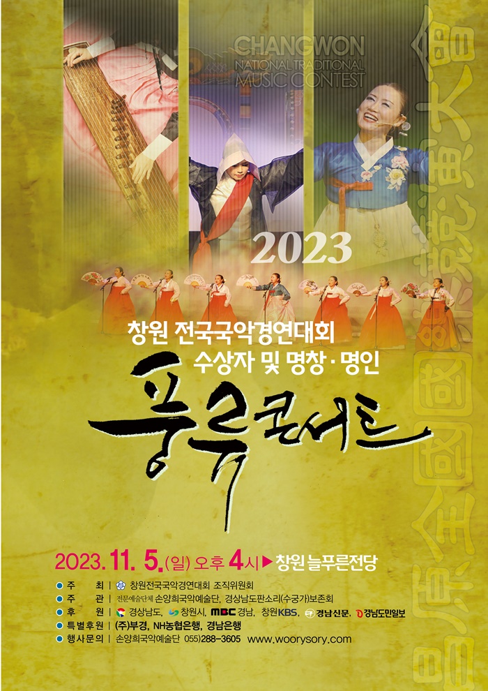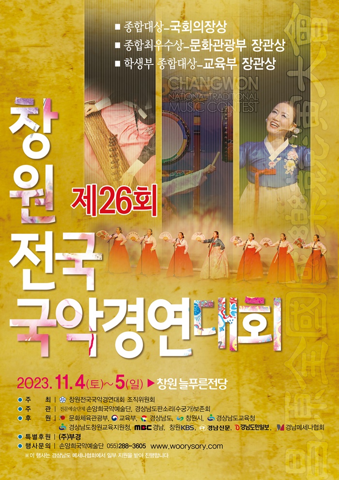 ÀÌ Çà»ç´Â Àü¹®¿¹¼ú´ÜüÀÎ ¼Õ¾çÈñ ±¹¾Ç¿¹¼ú´Ü°ú °æ»ó³²µµ ÆÇ¼Ò¸®º¸Á¸È¸°¡ ÁÖ°üÇϰí, ¹®ÈüÀ°°ü±¤ºÎ, ±³À°ºÎ, °æ»ó³²µµ, °æ»ó³²µµ ±³À°Ã», â¿øÆ¯·¹½Ã, °æ»ó³²µµ â¿ø±³À°Áö¿øÃ», MBC°æ³², â¿øKBS, °æ³²½Å¹®, °æ³²µµ¹ÎÀϺ¸°¡ ÈÄ¿øÇϰí, (ÁÖ) ºÎ°æ, NH³óÇù, °æ³²ÀºÇàÀÌ Æ¯º°ÈÄ¿øÇß´Ù.