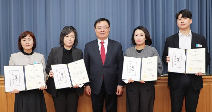 | â¿øÆ¯·Ê½Ã´Â Á¦3ȸ 'ÀÌ´ÞÀÇ ¿ì¼ö°ø¹«¿ø' ǥâÀ» ¼ö¿©Çß´Ù. »çÁø ¿ÞÂʺÎÅÍ È²¹ÌÁ¤ Æò»ý±³À°°ú Çб³Áö¿øÆÀÀå, Á¤»ï¼ø ȯ°æÁ¤Ã¥°ú ȯ°æ±³À°ÆÀÀå, È«³²Ç¥ â¿ø½ÃÀå, ¿øÇý¿µ ÀÇⱸ ºÀ¸²µ¿ Ãѹ«ÆÀÀå, ±èÇö¼ö ±³ÅëÁ¤Ã¥°ú ÁÖ¹«°ü. |