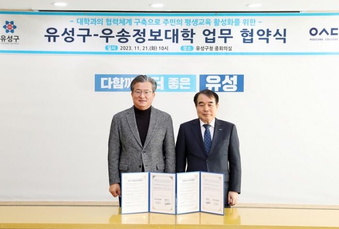 | À¯¼º±¸(±¸Ã»Àå Á¤¿ë·¡, ¿ÞÂÊ)´Â 21ÀÏ ±¸Ã» ÁßȸÀǽǿ¡¼ ¿ì¼ºÁ¤º¸´ëÇÐ(ÃÑÀå ÀÌ´Þ¿µ, ¿À¸¥ÂÊ)°ú Æò»ý±³À° Ȱ¼ºÈ ¾÷¹«Çù¾àÀ» ¸Î¾ú´Ù |