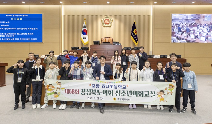 [½Ã»çÄÚ¸®¾ÆÀú³Î=±è¿¬ÇÐ ±âÀÚ] °æºÏµµÀÇȸ(ÀÇÀå ¹èÇÑö)´Â 29ÀÏ °æ»óºÏµµÀÇȸ º»È¸ÀÇÀå¿¡¼ Æ÷Ç× È¿ÀÚÃʵîÇб³ ÇлýÀ» ´ë»óÀ¸·Î Á¦68ȸ °æ»óºÏµµÀÇȸ û¼Ò³âÀÇȸ±³½ÇÀ» °³ÃÖÇß´Ù.
