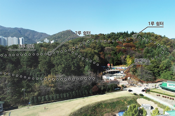 ƯÈ÷, ŰÁî¾ß±¸Àå°ú ¾î¸°À̳îÀÌÅͰ¡ À§Ä¡ÇÑ È¨º£À̽º¸¦ ±âÁØÀ¸·Î ±âÁ¸ µî»ê·Î¸¦ Ȱ¿ëÇÑ 1·ç, 2·ç, 3·ç ½°Å͸¦ Á¶¼ºÇØ Àüü °ø¿øÀÌ ¾ß±¸ÀåÀÇ Çü»óÀÌ µÇµµ·Ï °ø°£À» ¹èÄ¡Çß´Ù.