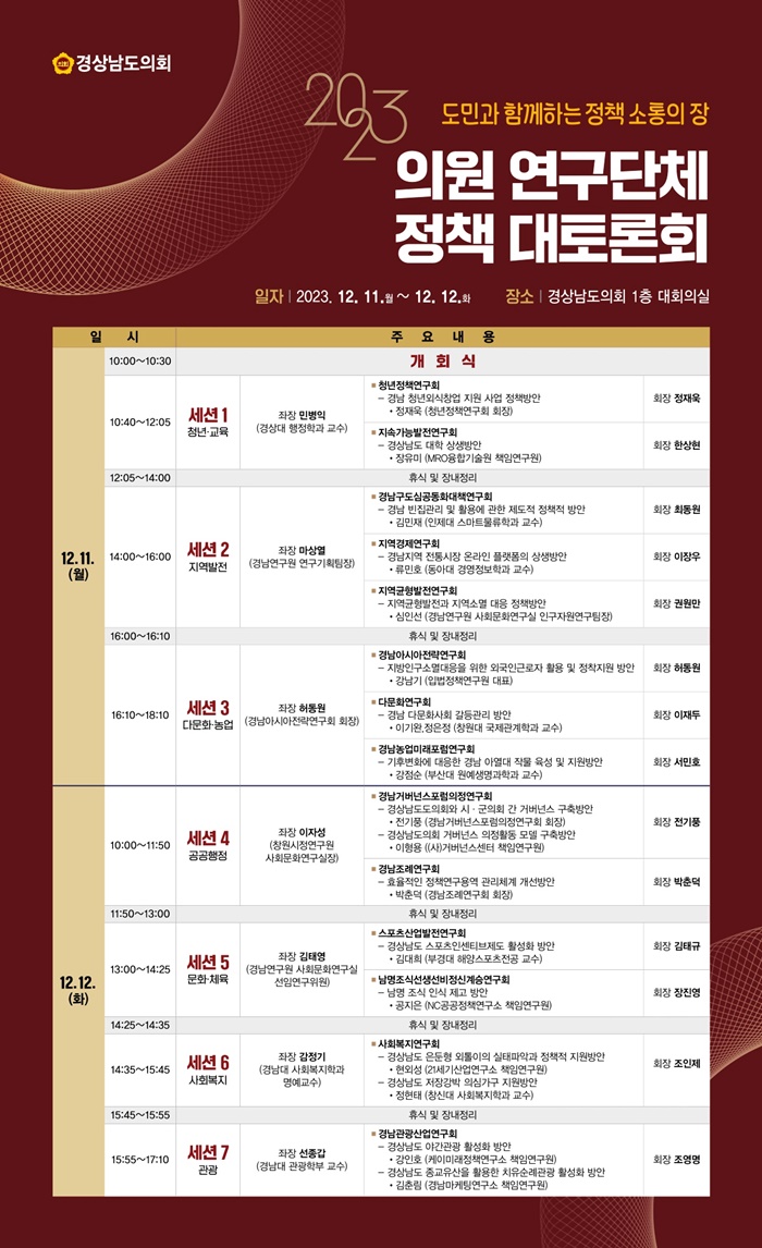 [½Ã»çÄÚ¸®¾ÆÀú³Î=Á¤Á¾¹Î ¼±ÀÓ±âÀÚ] °æ³²µµÀÇȸ(ÀÇÀå ±èÁøºÎ)´Â ÀÇȸÀÇ ÀÔ¹ý ¹× Á¤Ã¥ ¿ª·®À» °ÈÇÏ°í µµ¹Î°úÀÇ Á¤Ã¥ ¼ÒÅëÀ» °ÈÇϱâ À§ÇØ ¿À´Â 11ÀϺÎÅÍ 12ÀϱîÁö ¾çÀϰ£ '2023 ÀÇ¿ø ¿¬±¸´Üü Á¤Ã¥ ´ëÅä·Ðȸ'¸¦ °³ÃÖÇÑ´Ù.