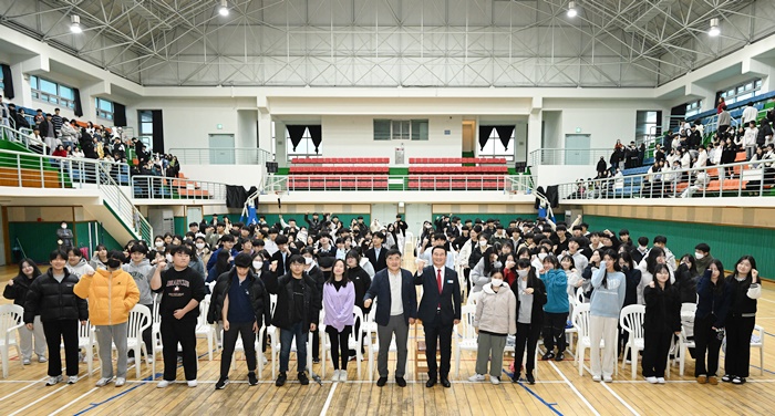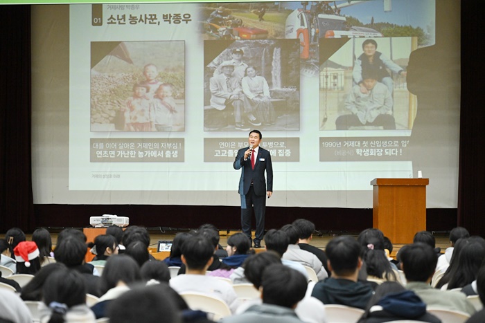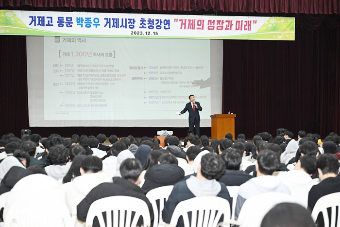[½Ã»çÄÚ¸®¾ÆÀú³Î=Á¤Á¾¹Î ¼±ÀÓ±âÀÚ] ¹ÚÁ¾¿ì °ÅÁ¦½ÃÀåÀÌ 15ÀÏ ¿ÀÈÄ ¸ð±³ÀÎ °ÅÁ¦°íµîÇб³(±³Àå ±èȸÁø)ÀÇ ÃÊûÀ¸·Î Çб³¸¦ ã¾Æ ‘°ÅÁ¦ÀÇ ¼ºÀå°ú ¹Ì·¡’¸¦ ÁÖÁ¦·Î Ưº° °¿¬°ú Çлýµé°úÀÇ ´ëÈÀÇ ½Ã°£À» °¡Á³´Ù.