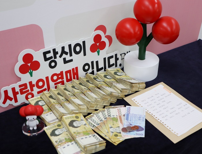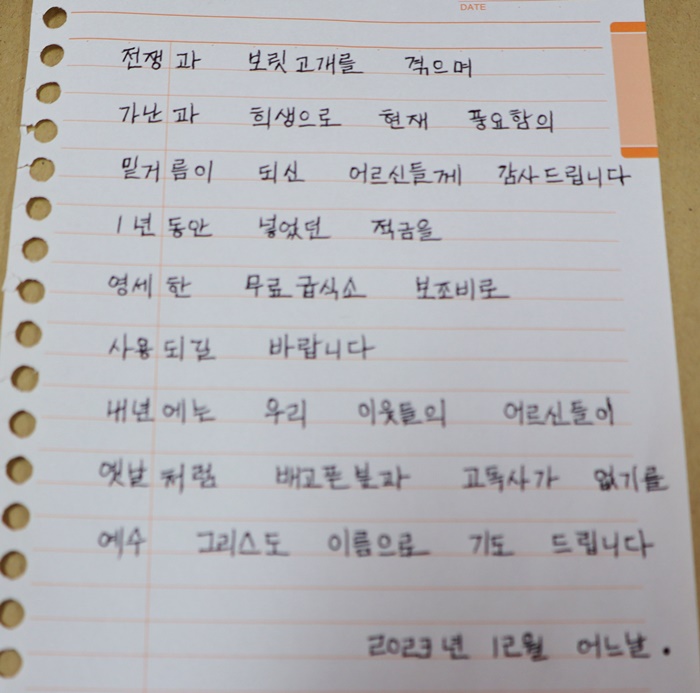 ¼º±ÝÀÌ ´ã±ä ¹Ú½º ¾È¿¡´Â ¼Õ ÆíÁö¿¡´Â “1³â°£ ¸ðÀº Àû±ÝÀ» º¸³½´Ù. ¿µ¼¼ÇÑ ¹«·á ±Þ½Ä¼Ò¿¡ ¼º±ÝÀÌ Àü´ÞµÇ¾î Áö¿ª»çȸ ¾î¸£½ÅµéÀÌ ¹è°íÇİú °íµ¶»ç°¡ ¾ø±â¸¦ ¹Ù¶õ´Ù"´Â ±âºÎÀÇ ¶æÀÌ ´ã°Ü ÀÖ¾ú´Ù.