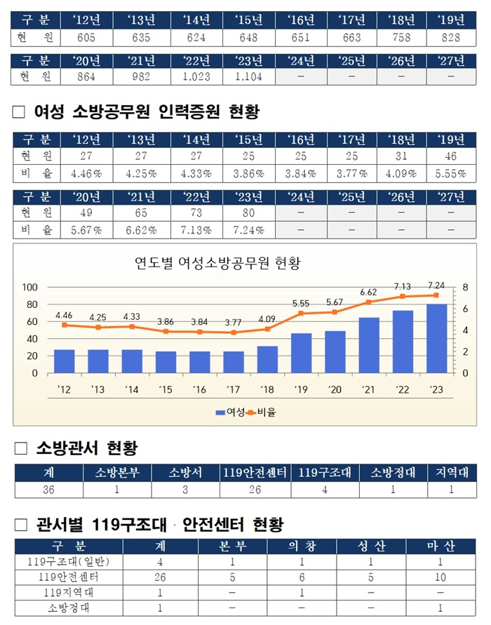 ±×¸®°í ¿©¼º ¼Ò¹æ°ø¹«¿øµéµµ 27¸í ½ÃÀÛÀ¸·Î 53¸í(196.3%)ÀÌ Áõ¿øµÅ 80¸íÀÇ ¿©¼º ¼Ò¹æ°ø¹«¿øµéÀÌ ±Ù¹«Çϰí ÀÖÀ¸¸ç, ³²¼º°ú ¿©¼º ºñÀ²·Î º¸¸é 4.46%¸¦ ½ÃÀÛÀ¸·Î ÇöÀç´Â 7.24%·Î ¿©¼º ºñÀ²ÀÌ ¸¹ÀÌ Áõ¿øµÈ °ÍÀ¸·Î ³ªÅ¸³µ´Ù.