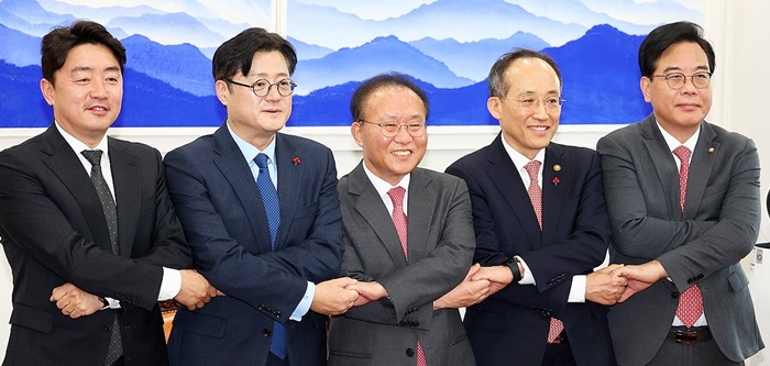 | ±¹¹ÎÀÇÈû À±Àç¿Á ´ç´ëÇ¥ ±ÇÇÑ´ëÇà°ú È«ÀÍÇ¥ ´õºÒ¾î¹ÎÁÖ´ç ¿ø³»´ëÇ¥ µîÀÌ 20ÀÏ ¿ÀÈÄ ±¹È¸ ¿î¿µÀ§¿øÀå½Ç¿¡¼ 2024³âµµ ¿¹»ê¿¡ ´ëÇØ ÃÖÁ¾ ÇÕÀÇÇÑ µÚ ±â³äÃÔ¿µÀ» Çϰí ÀÖ´Ù. /°øµ¿ÃëÀç |