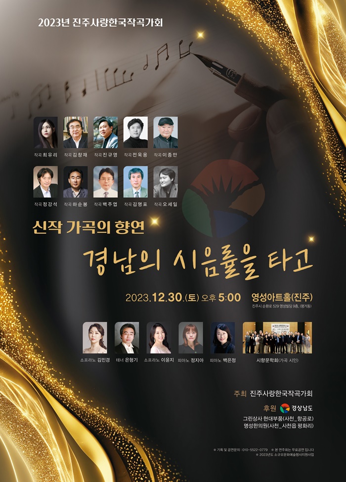[½Ã»çÄÚ¸®¾ÆÀú³Î=Á¤Á¾¹Î ¼±ÀÓ±âÀÚ] ÁøÁÖ»ç¶ûÇѱ¹À۰ȸ´Â ¿À´Â 30ÀÏ ¿ÀÈÄ 5½Ã ÁøÁÖ ¿µ¼º¾ÆÆ®È¦¿¡¼ '°æ³²ÀÇ ½ÃÀ½·üÀ» Ÿ°í' ¶ó´Â ÁÖÁ¦·Î ½ÅÀÛ°¡°îÀÇ Ç⿬À» °³ÃÖÇÑ´Ù.