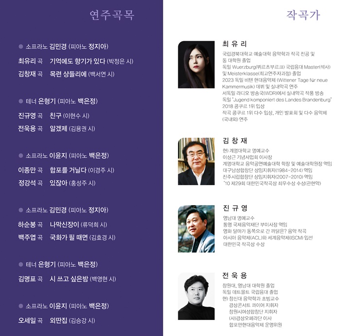 ºÒ¸®¿öÁö´Â ÀÛǰÀ¸·Î´Â ¡ãÀÛ°î°¡ ÃÖÀ¯¸®ÀÇ '±â¾ï¿¡µµ Çâ±â°¡ ÀÖ´Ù' (¹ÚÁ¤Àº ½Ã) ¡ãÀÛ°î°¡ ±èâÀçÀÇ '¸ñ·Ã ¼§µé¸®¿¡'(¹é¼¿¬ ½Ã) ¡ãÀÛ°î°¡ Áø±Ô¿µÀÇ 'Ä£±¸'(ÀÌÇö¼ö ½Ã) ¡ãÀÛ°î°¡ Àü¿í¿ëÀÇ '¾Ë°ÚÁ¦'(±è¿ë±Ç ½Ã) ¡ãÀÛ°î°¡ ÀÌÁ¾¸¸ÀÇ 'ÇÕÆ÷¸¦ °Å´Ò´Ù'(À̰æÁÖ ½Ã) ¡ãÀÛ°î°¡ Á¤°¼®ÀÇ 'ÀÖÀݾÆ'(È«¼ºÁÖ ½Ã) ¡ãÀÛ°î°¡ ÇϼøºÀÀÇ '³ª¸·½ÅÀåÀÌ'(·ù´öÈñ ½Ã) ¡ãÀÛ°î°¡ ¹éÁÖ¿±ÀÇ '±¹È°¡ ÇÊ ¶§¸é'(±èÈ¿°æ ½Ã) ¡ãÀÛ°î°¡ ±è¸íÇ¥ÀÇ '½Ã ¾²°í ½ÍÀº¹ã'(¹é¿µÇö ½Ã) ¡ãÀÛ°î°¡ ¿À¼¼ÀÏÀÇ '¿ÜµýÁý'(±è½Â° ½Ã)¸¦ ³ë·¡ ÇÑ´Ù.
