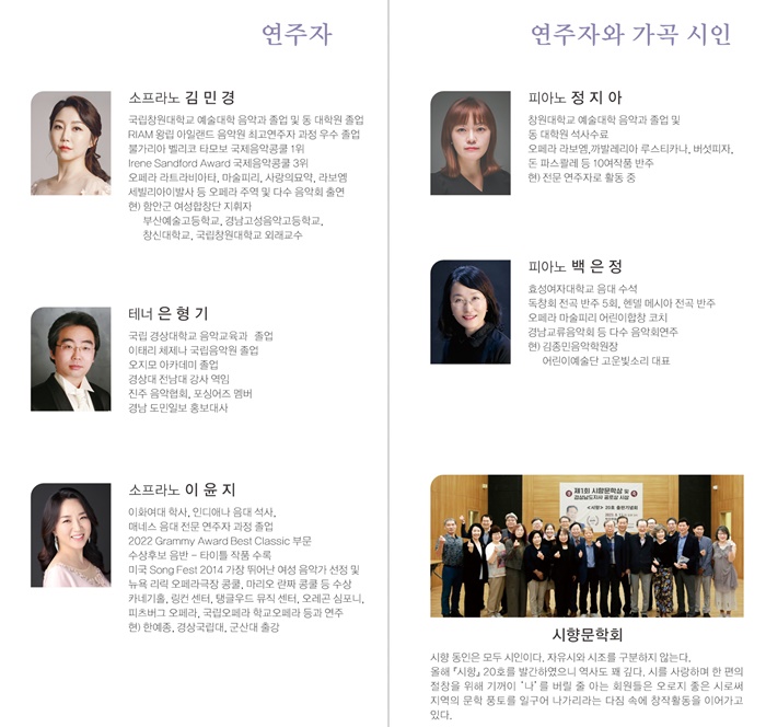 ¸Å³â 3ȸ ÀÌ»ó ½ÅÀÛ°¡°îÀ» ¹ßÇ¥ÇÏ´Â ÁøÁÖ»ç¶ûÀ۰ȸÀÇ À̹ø °ø¿¬Àº ÁøÁÖ¿Í °æ³²À» ´ëÇ¥ÇÏ´Â ÀÛ°î°¡µéÀÌ Ã¢¿ø ½ÃÇâ¹®ÇÐȸ ȸ¿øµéÀÇ ½Ã¿¡ °îÁ¶¸¦ ºÙÇô ÇÇ¾Æ³ë ¹ÝÁÖ·Î ³ë·¡ÇÑ´Ù.